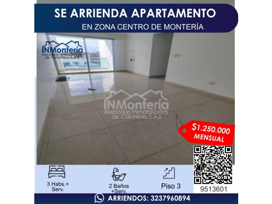 SE ARRIENDA APARTAMENTO EN ZONA CENTRO DE MONTERIA