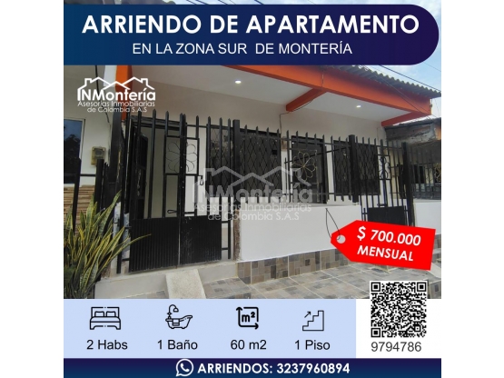 SE ARRIENDA APARTAMENTO EN ZONA SUR DE MONTERIA<!--StartFragment -->