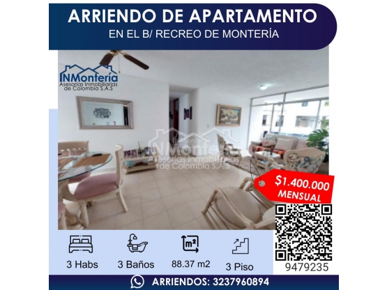 ARRIENDO DE APARTAMENTO EN BARRIO EL RECREO DE MONTERÍA