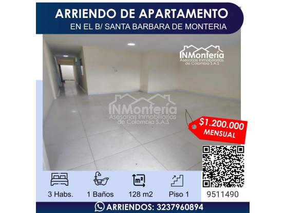 SE ARRIENDA APARTAMENTO EN EL BARRIO SANTA BARBARA DE MONTERIA