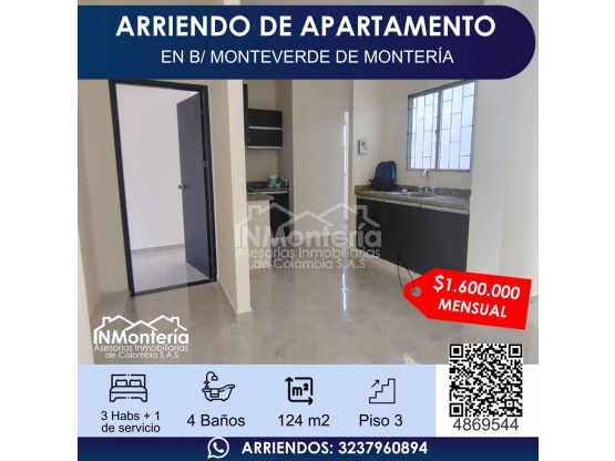 SE ARRIENDA APARTAMENTO EN BARRIO MONTEVERDE DE MONTERIA