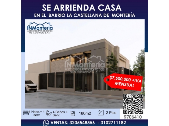 SE ARRIENDA CASA DE DOS PISOS EN EL BARRIO LA CASTELLANA DE MONTERIA