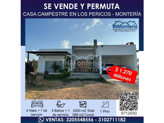 SE VENDE Y PERMUTA CASA CAMPESTRE EN LOS PERICOS DE MONTERIA
