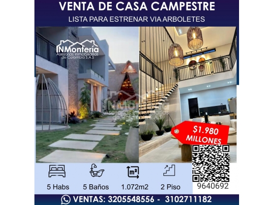 VENTA DE CASA CAMPESTRE DE LUJO - LISTA PARA ESTRENAR VIA  ARBOLETES