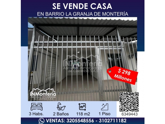 SE VENDE CASA EN BARRIO LA GRANJA DE MONTERIA