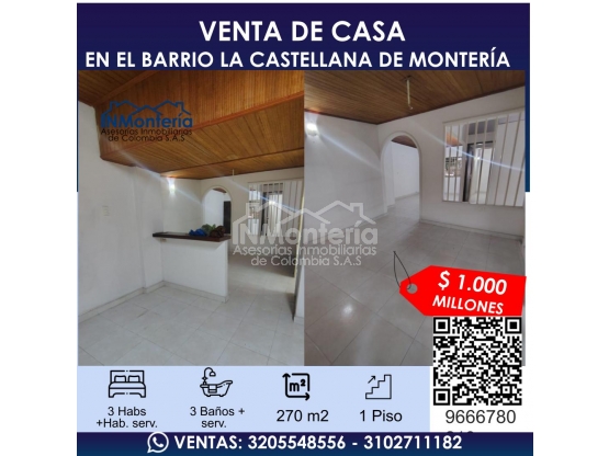 VENTA DE CASA EN EL BARRIO LA CASTELLANA DE MONTERIA