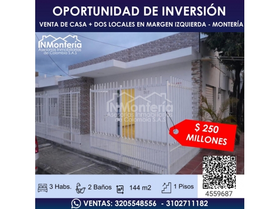 VENTA DE HERMOSA CASA + DOS LOCALES EN MARGEN IZQUIERDA DE MONTERIA