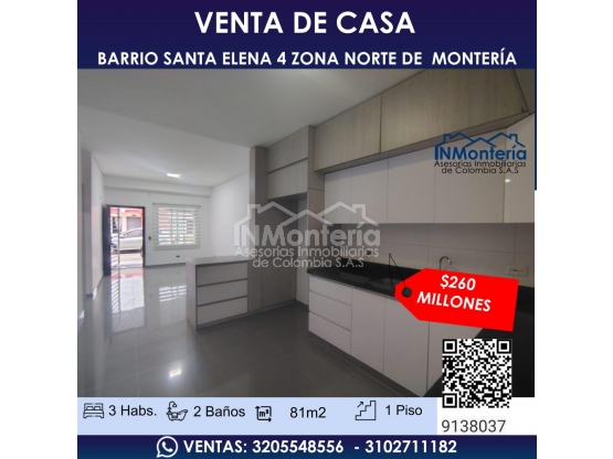 VENTA DE CASA EN EL BARRIO SANTA ELENA 4 ZONA ORIENTE DE MONTERIA