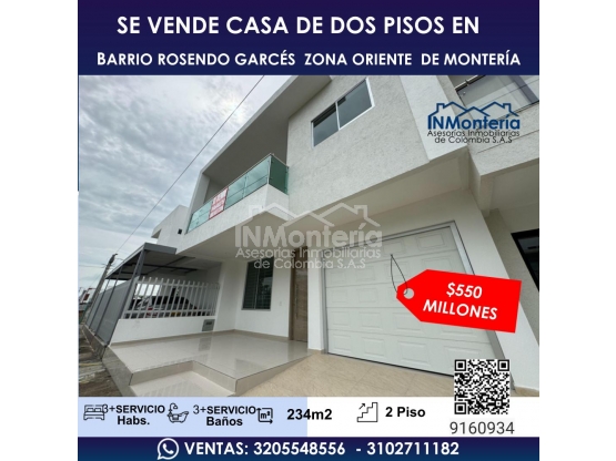 VENTA DE CASA DE DOS PISOS EN ROSENDO GARCÉS ZONA ORIENTAL  DE MONTERIA