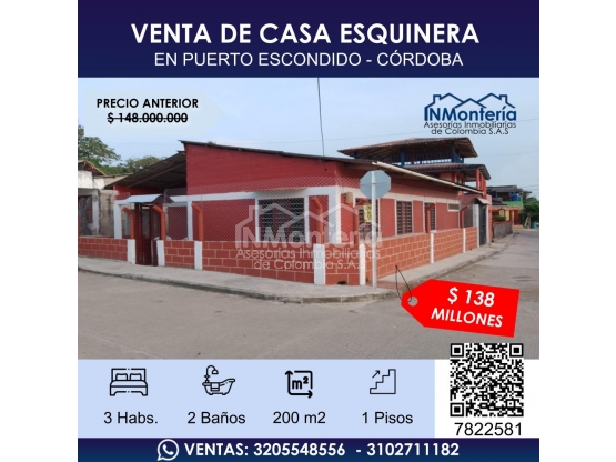 VENTA DE CASA ESQUINERA EN PUERTO ESCONDIDO- CÓRDOBA