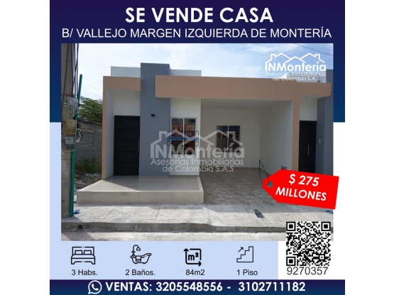 SE VENDE CASA EN BARRIO VALLEJO MARGEN IZQUIERDA DE MONTERIA