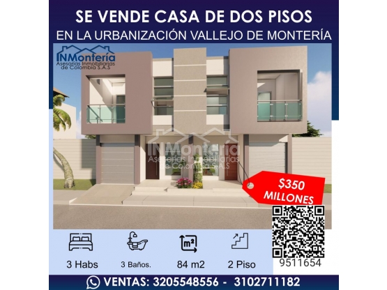 SE VENDE CASA DE DOS PISOS EN LA URBANIZACIÓN VALLEJO DE MONTERIA