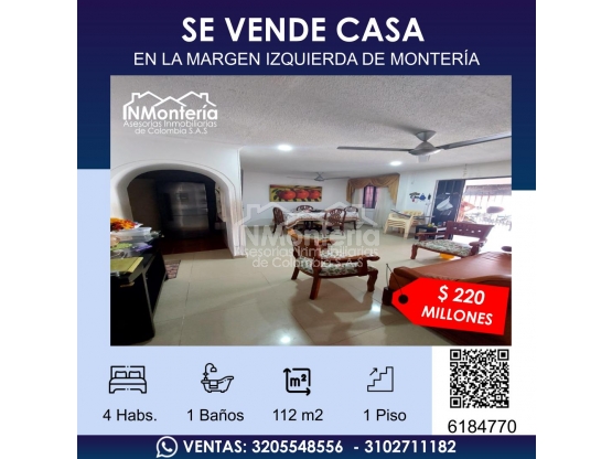 SE VENDE CASA EN LA MARGEN IZQUIERDA DE MONTERIA
