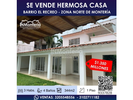 SE VENDE CASA EN EL BARRIO RECREO ZONA NORTE DE MONTERIA