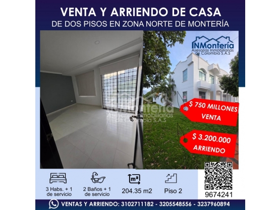 SE VENDE Y ARRIENDA HERMOSA CASA DE DOS PISOS EN ZONA NORTE DE MONTERIA