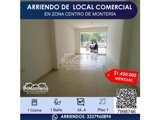 SE ARRIENDA LOCAL COMERCIAL EN ZONA CENTRO DE MONTERIA
